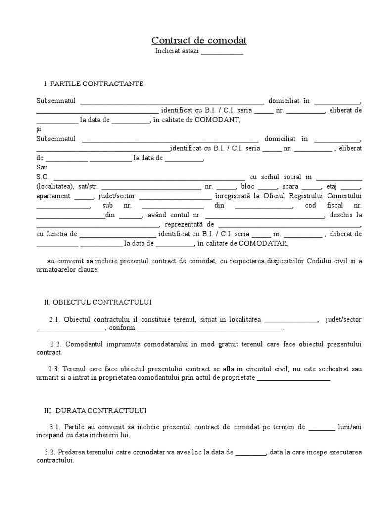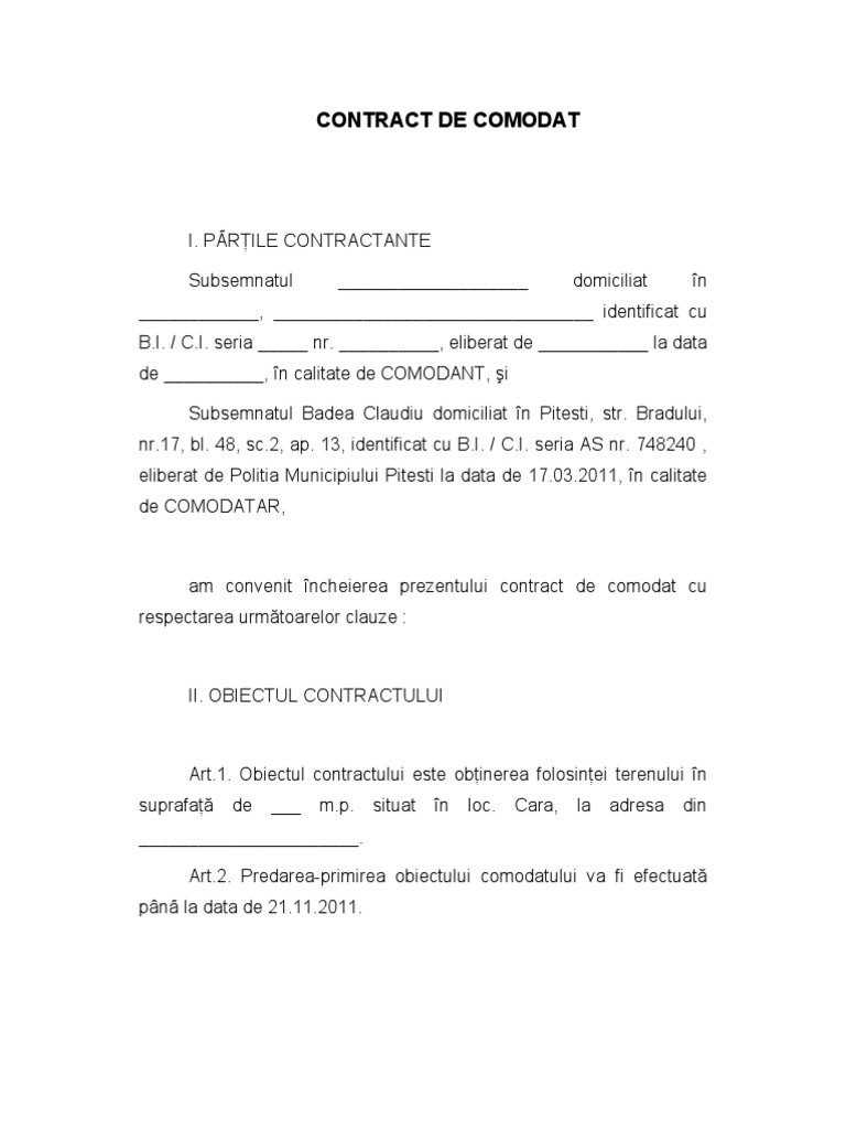Model Contract De Comodat